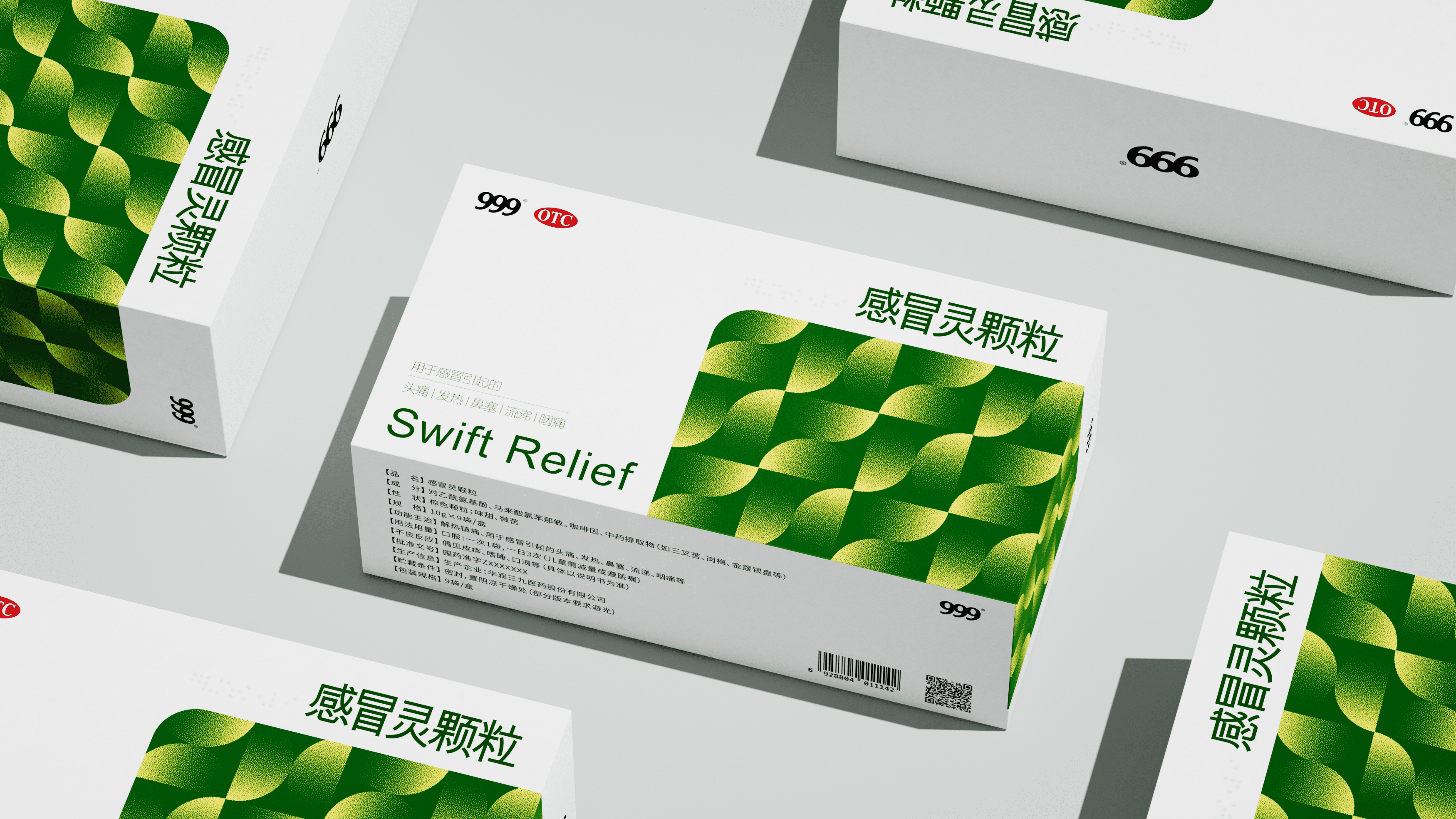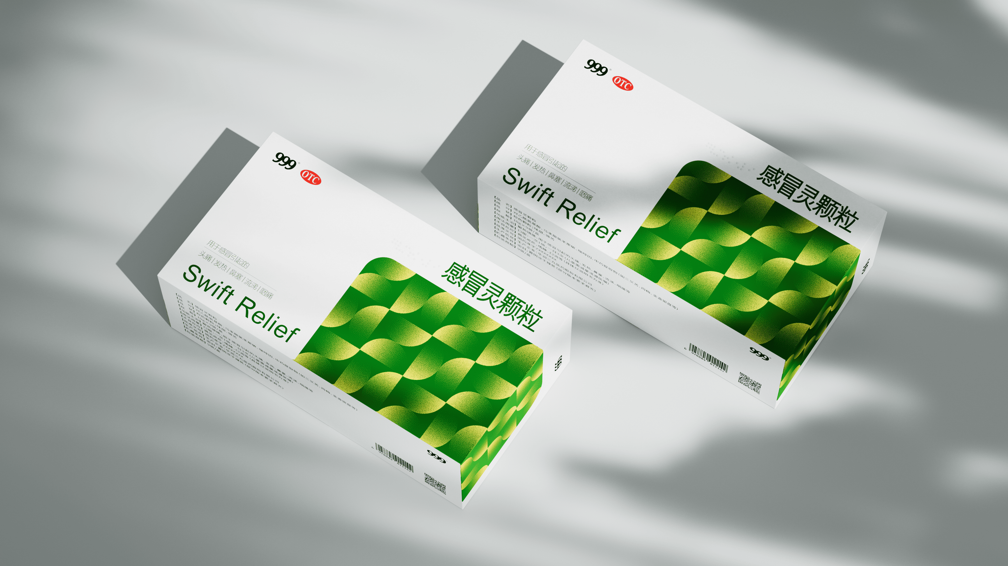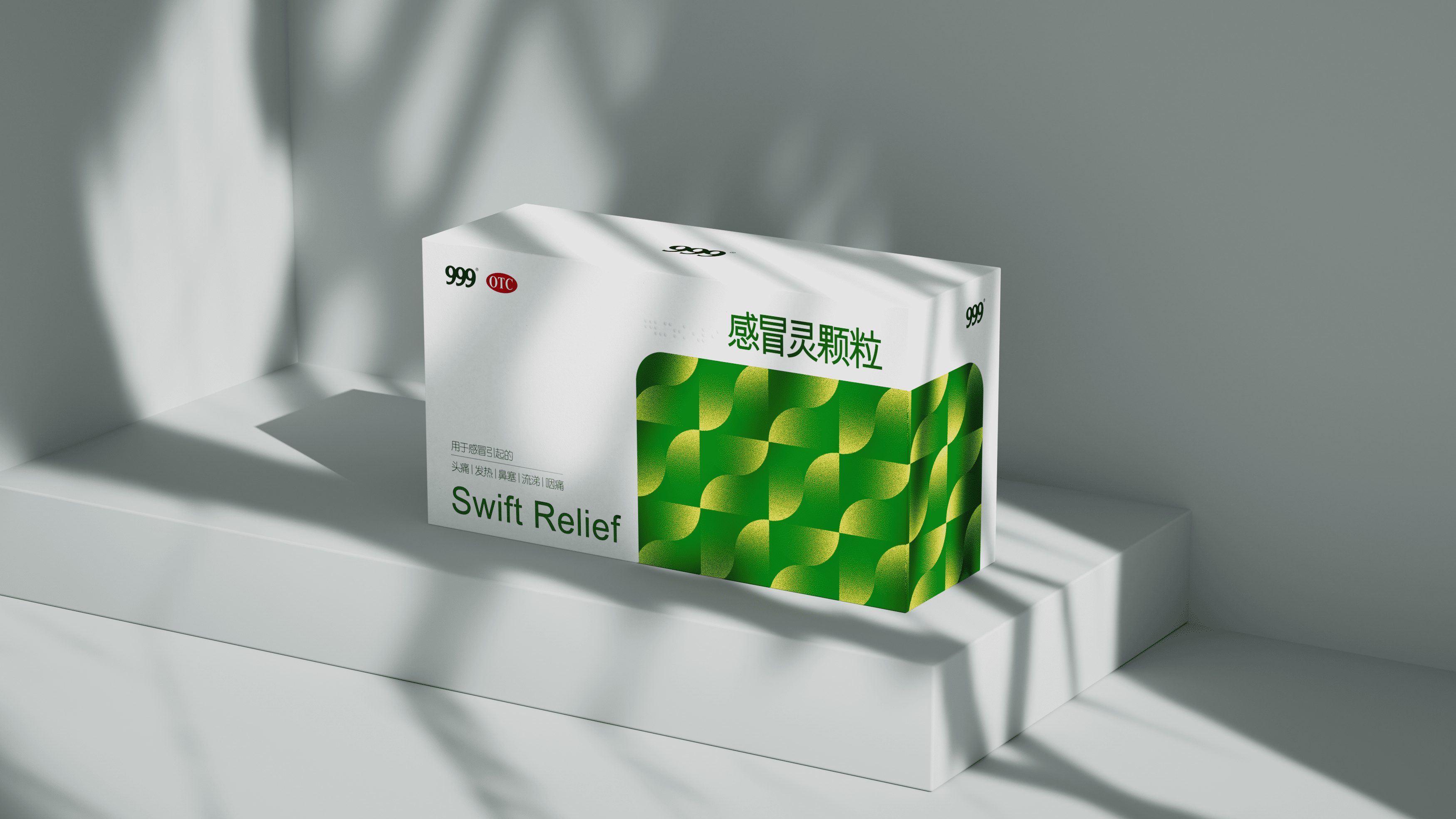 上海米克设计为华润三九焕新包装:保留 “999”“OTC” 标识锚定认知,主视觉用清新绿调流动几何纹,既衬 “舒缓治愈” 属性,又强化终端辨识度;同时优化信息层级,让功效、规格更醒目,以现代质感升级经典产品。