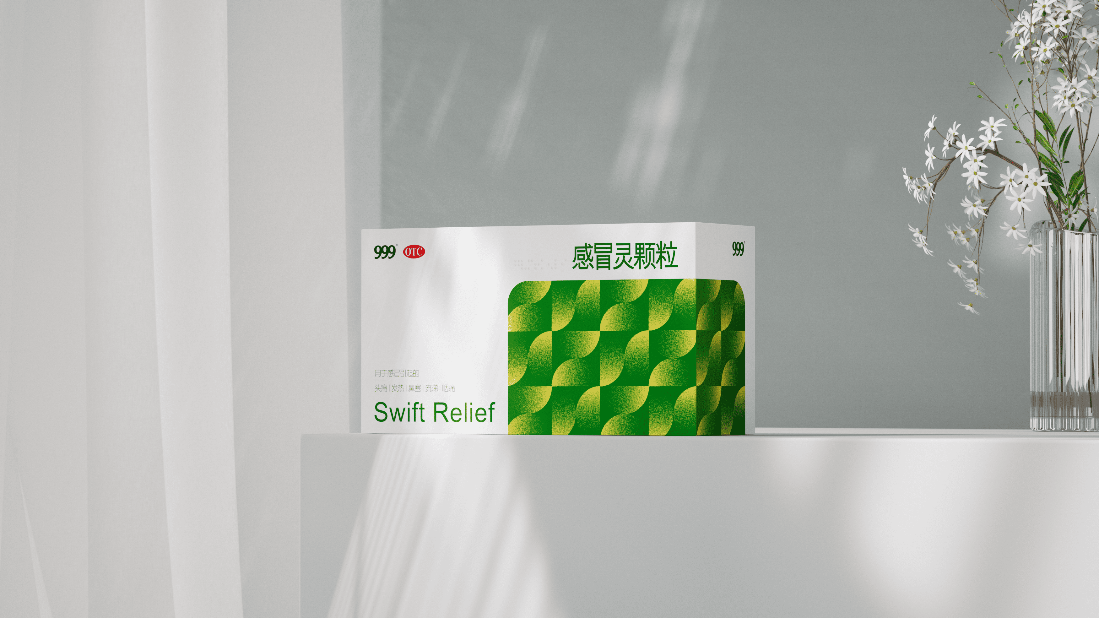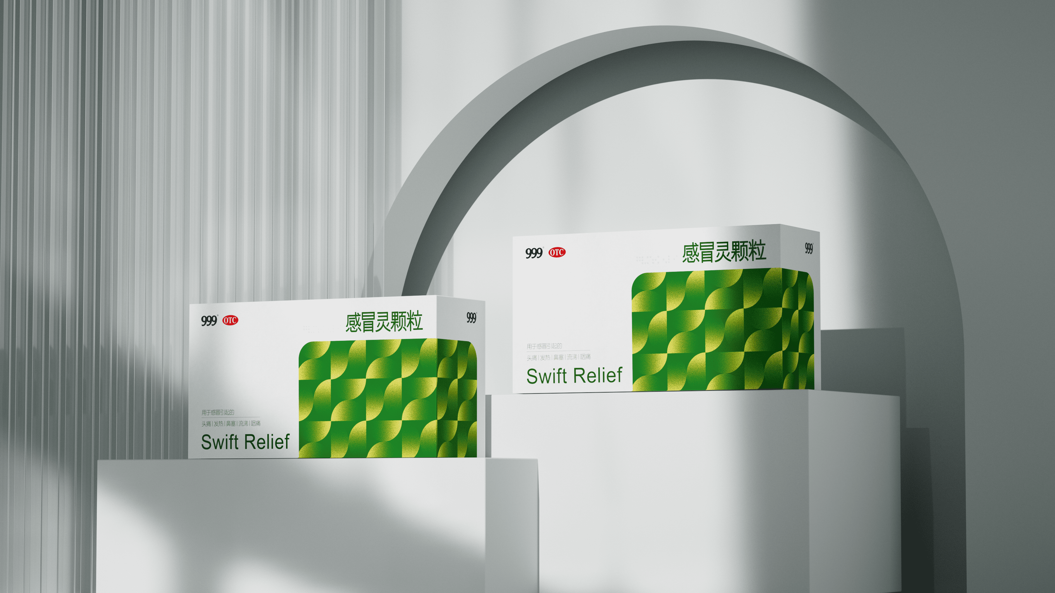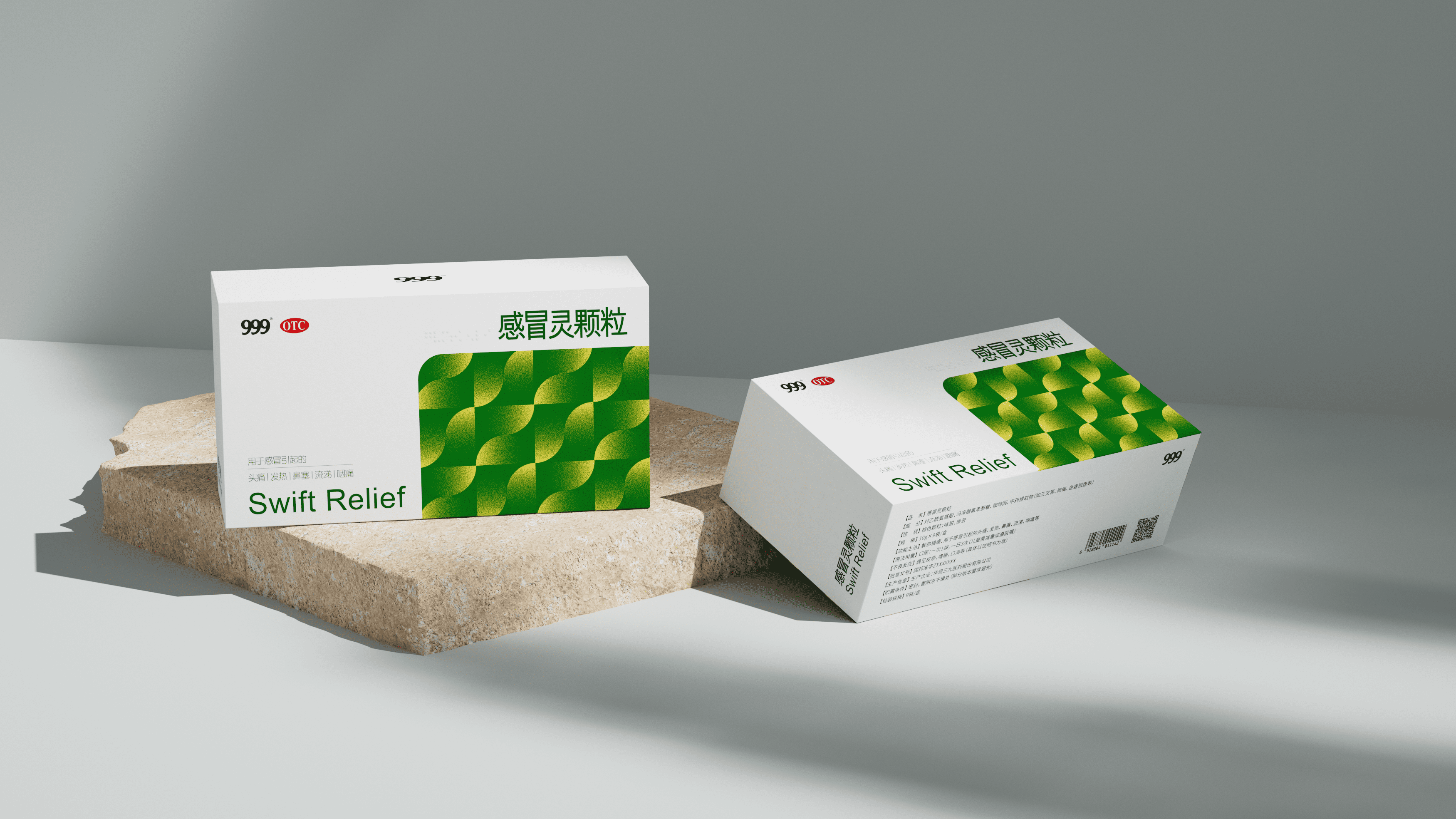 上海米克设计为华润三九焕新包装:保留 “999”“OTC” 标识锚定认知,主视觉用清新绿调流动几何纹,既衬 “舒缓治愈” 属性,又强化终端辨识度;同时优化信息层级,让功效、规格更醒目,以现代质感升级经典产品。