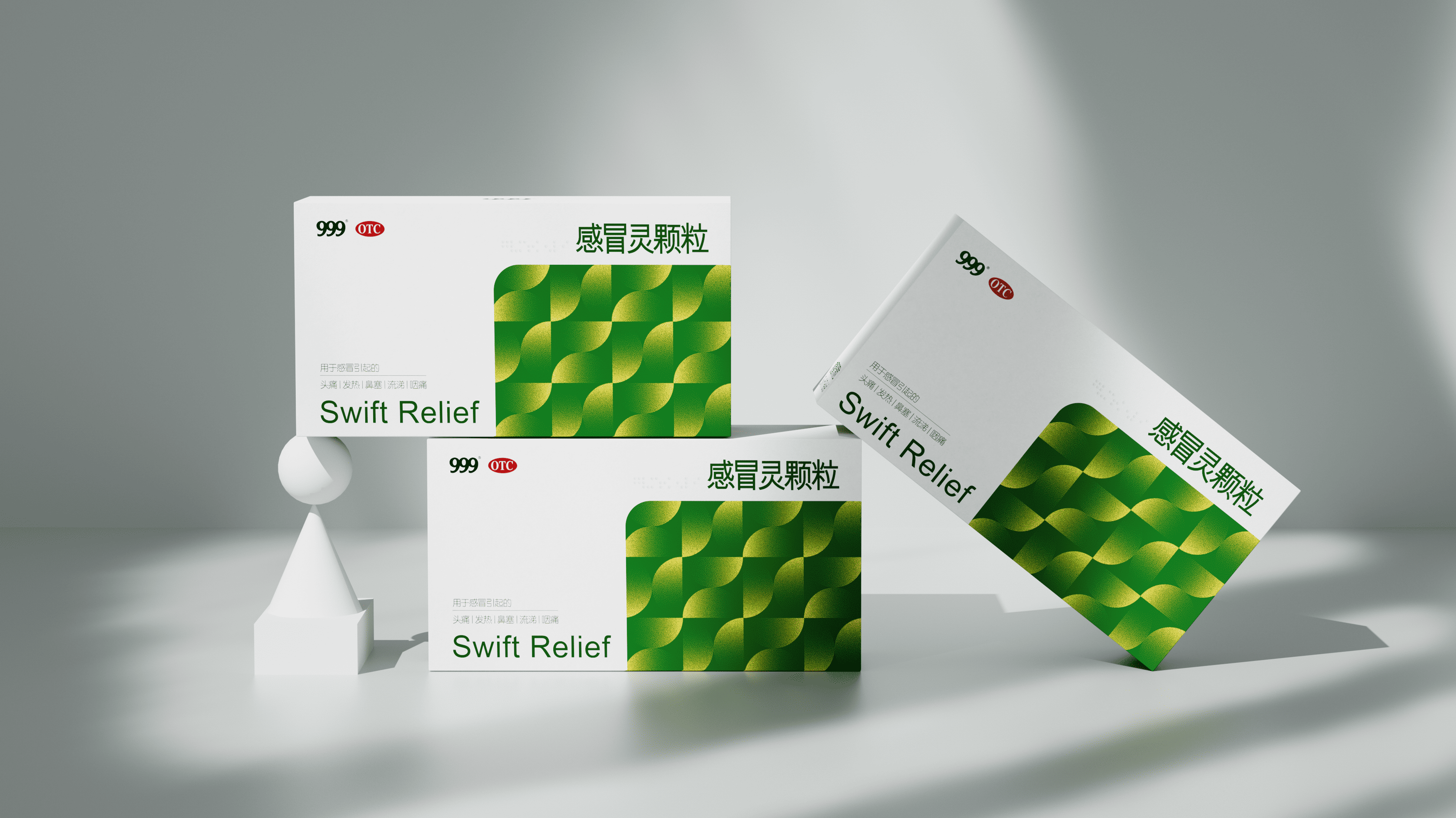 流动的 “叶片 / 波浪” 形态 + 清新绿调,既弱化了药品的 “冰冷感”,又传递出 “舒缓治愈” 的健康联想,契合感冒灵 “温和不刺激” 的产品属性。图形的柔和曲线与 “999” 国民品牌的 “亲民、可靠” 调性呼应,同时质感直接提升了包装的现代审美,让经典产品更贴合当下家庭的视觉偏好。