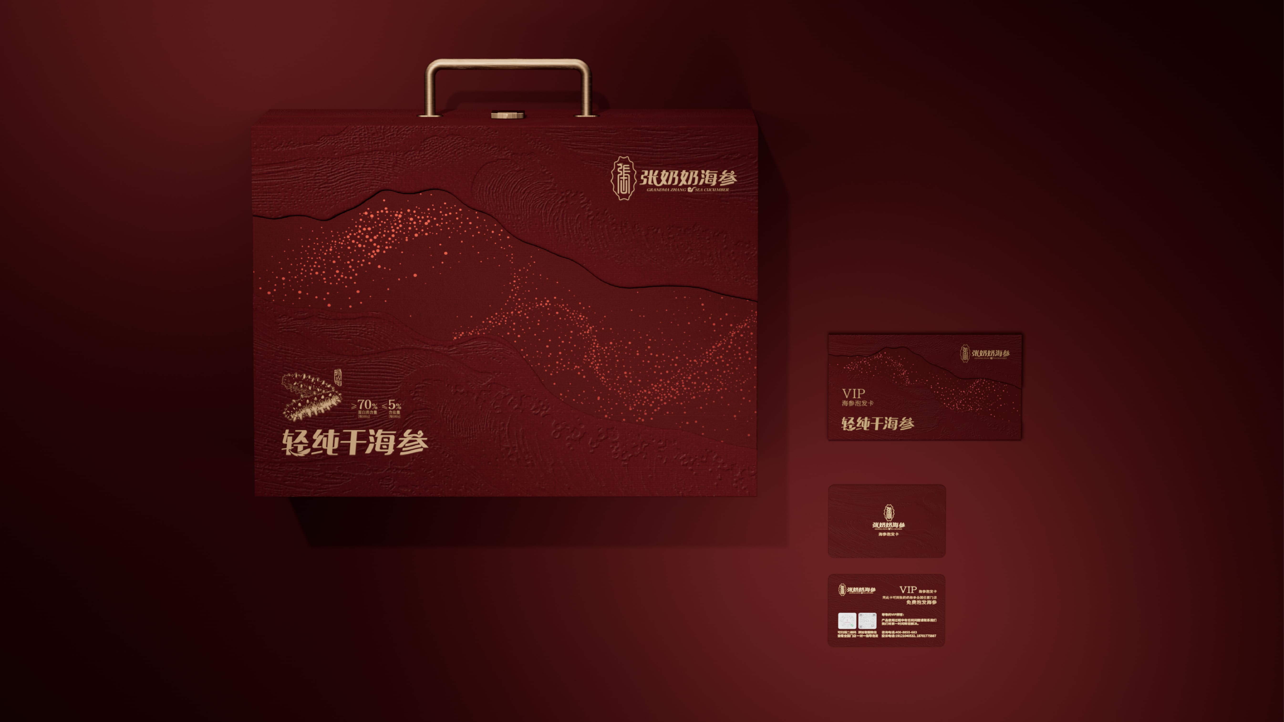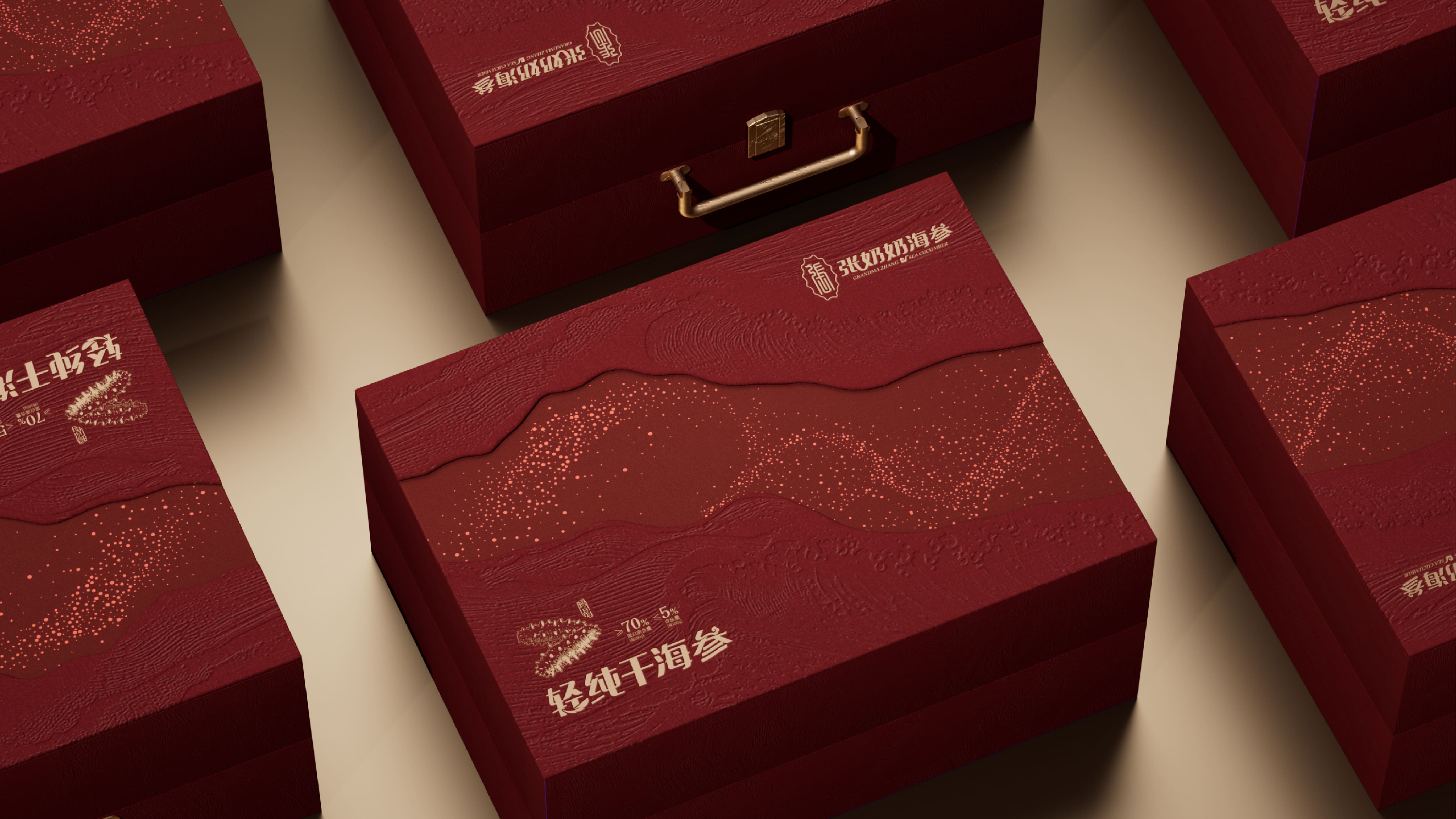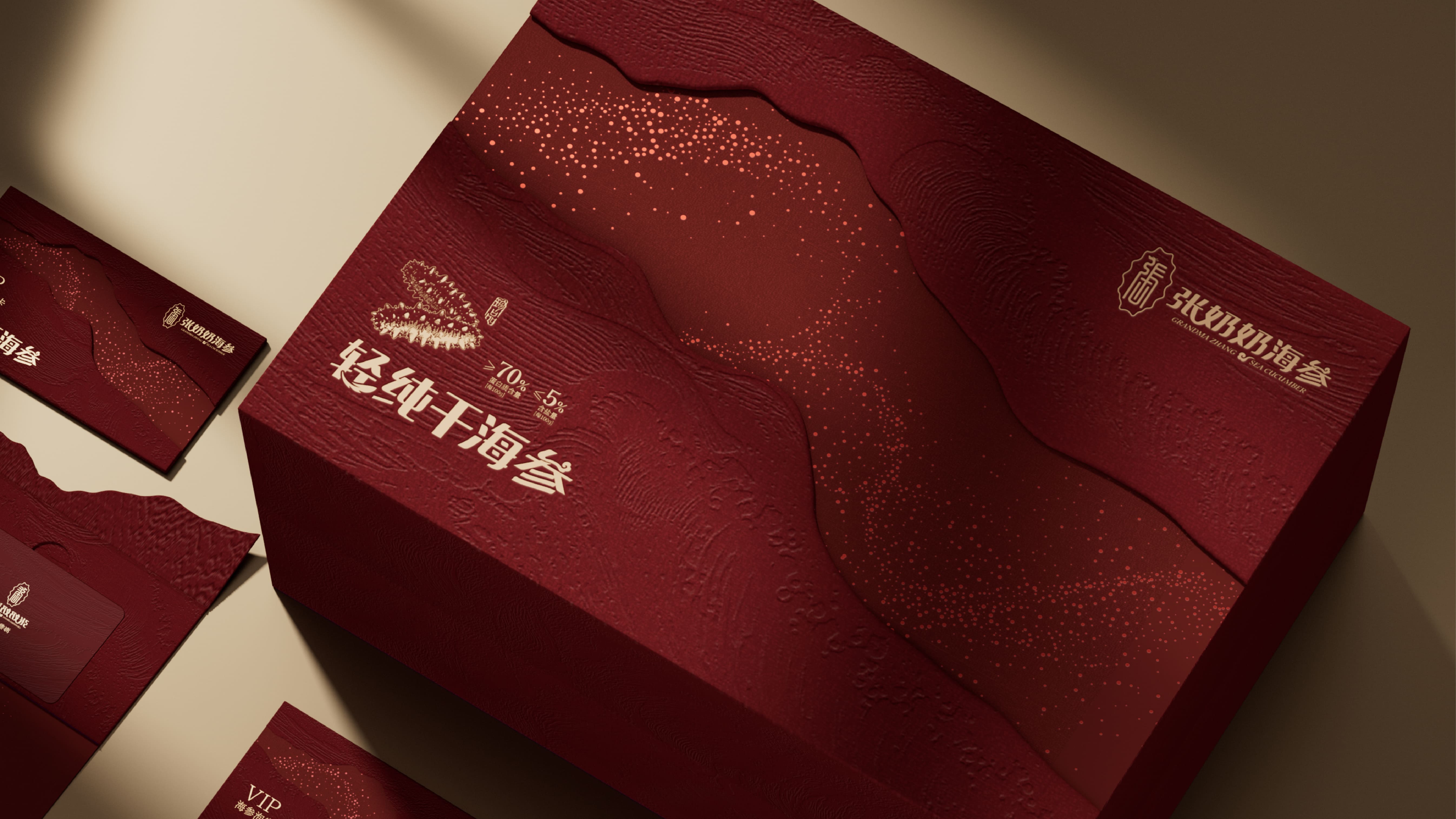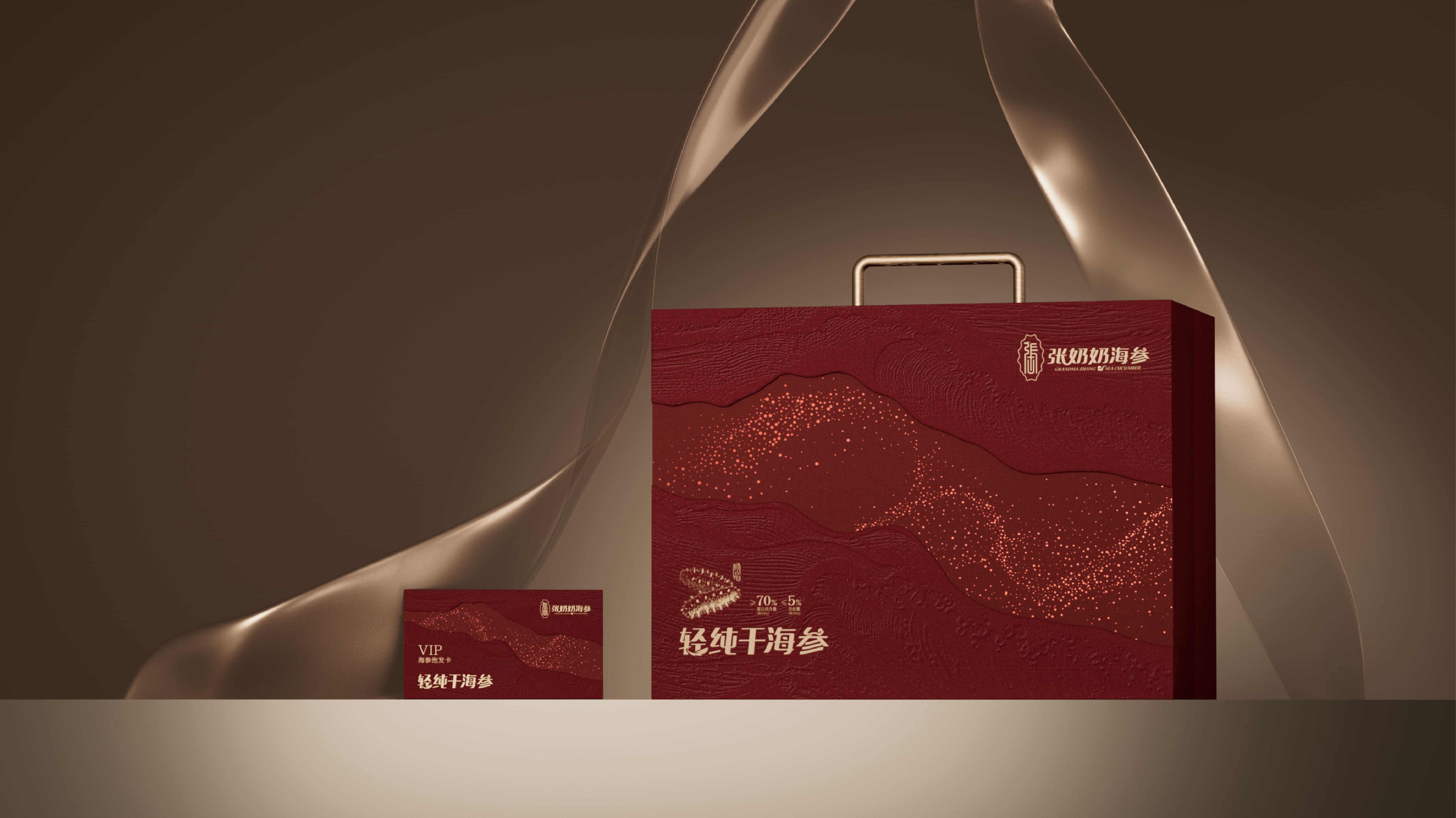 我们为张奶奶海参打造了一款高档礼盒,以深海美学与高端质感为核心。主体选用典雅红棕色调,浮雕海浪压纹还原大海肌理,金色沙粒点缀具象海洋栖息环境,营造轻奢层次。搭配金属提手,融入品牌标识与产品信息,融合海洋元素与高端属性,传递滋补价值与礼赠格调,VIP 卡设计更强化尊贵服务感。