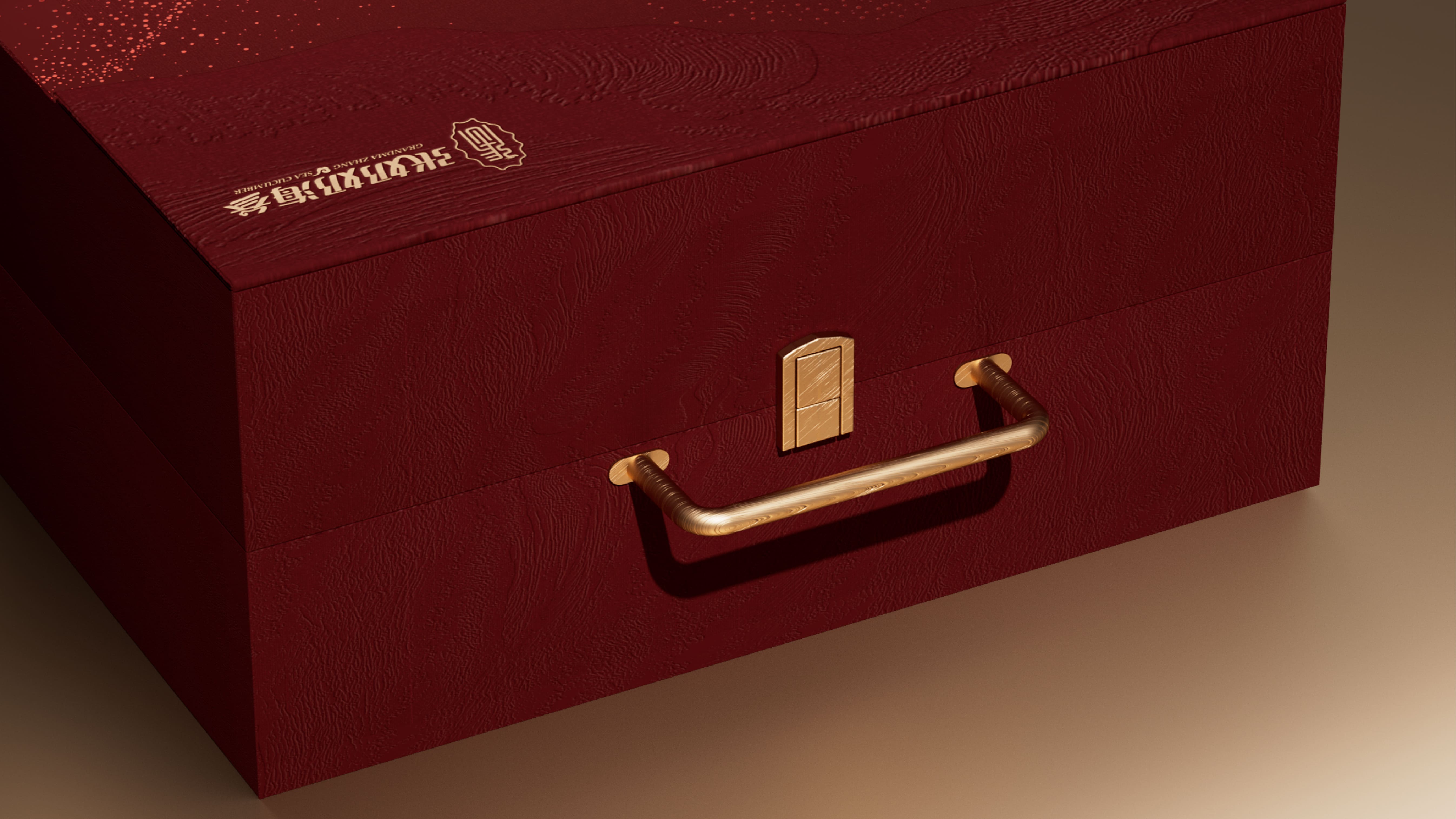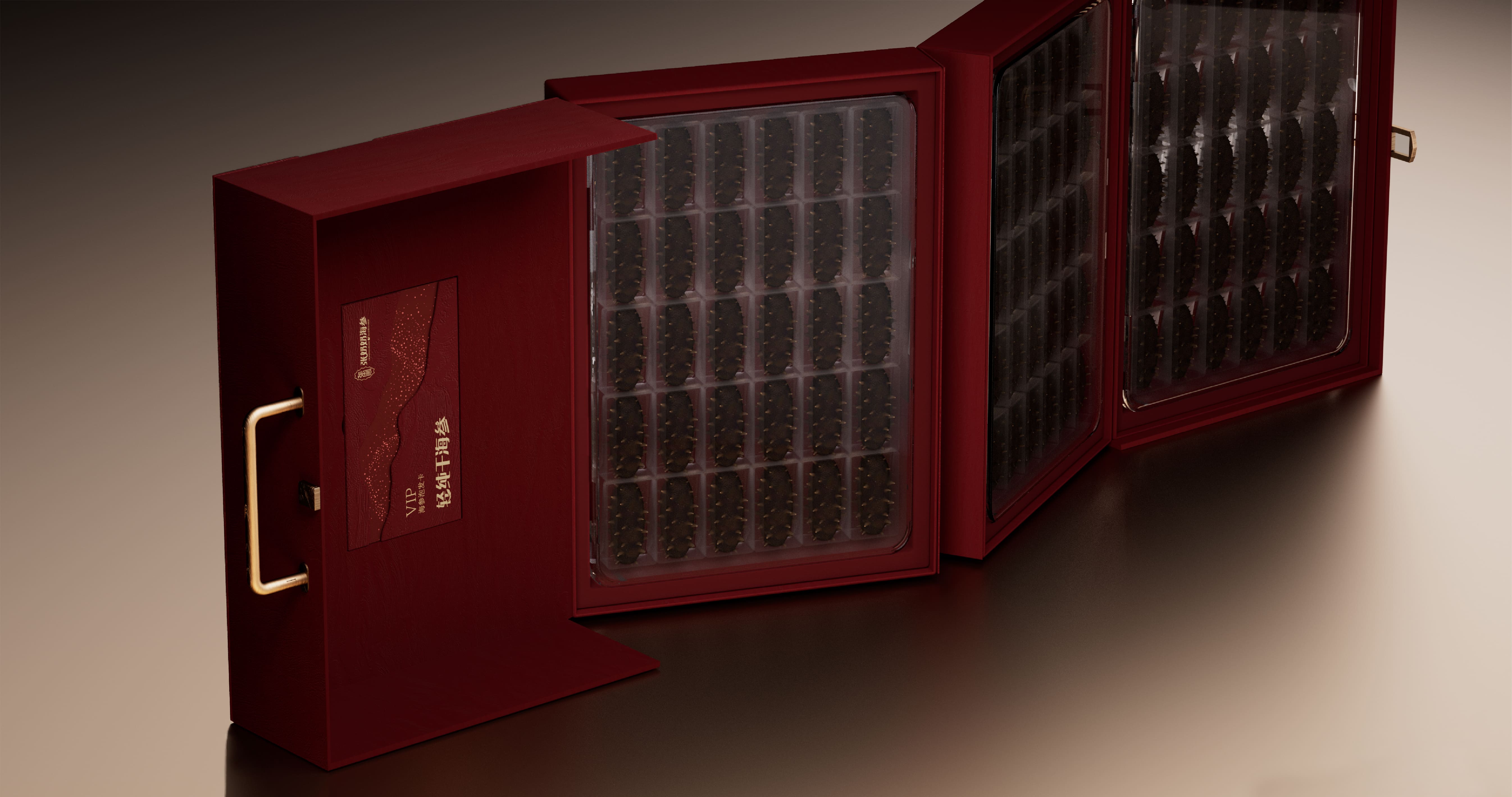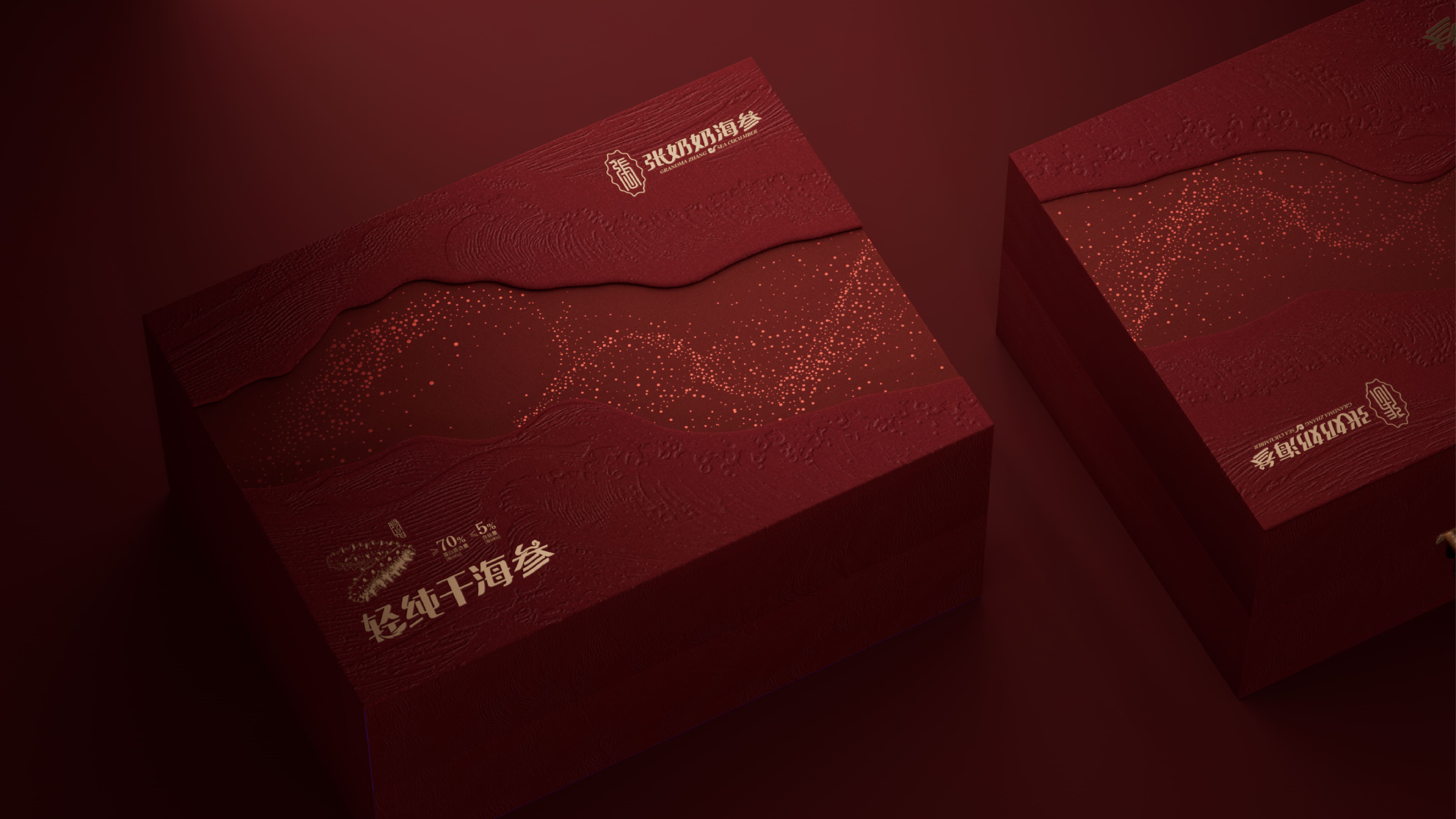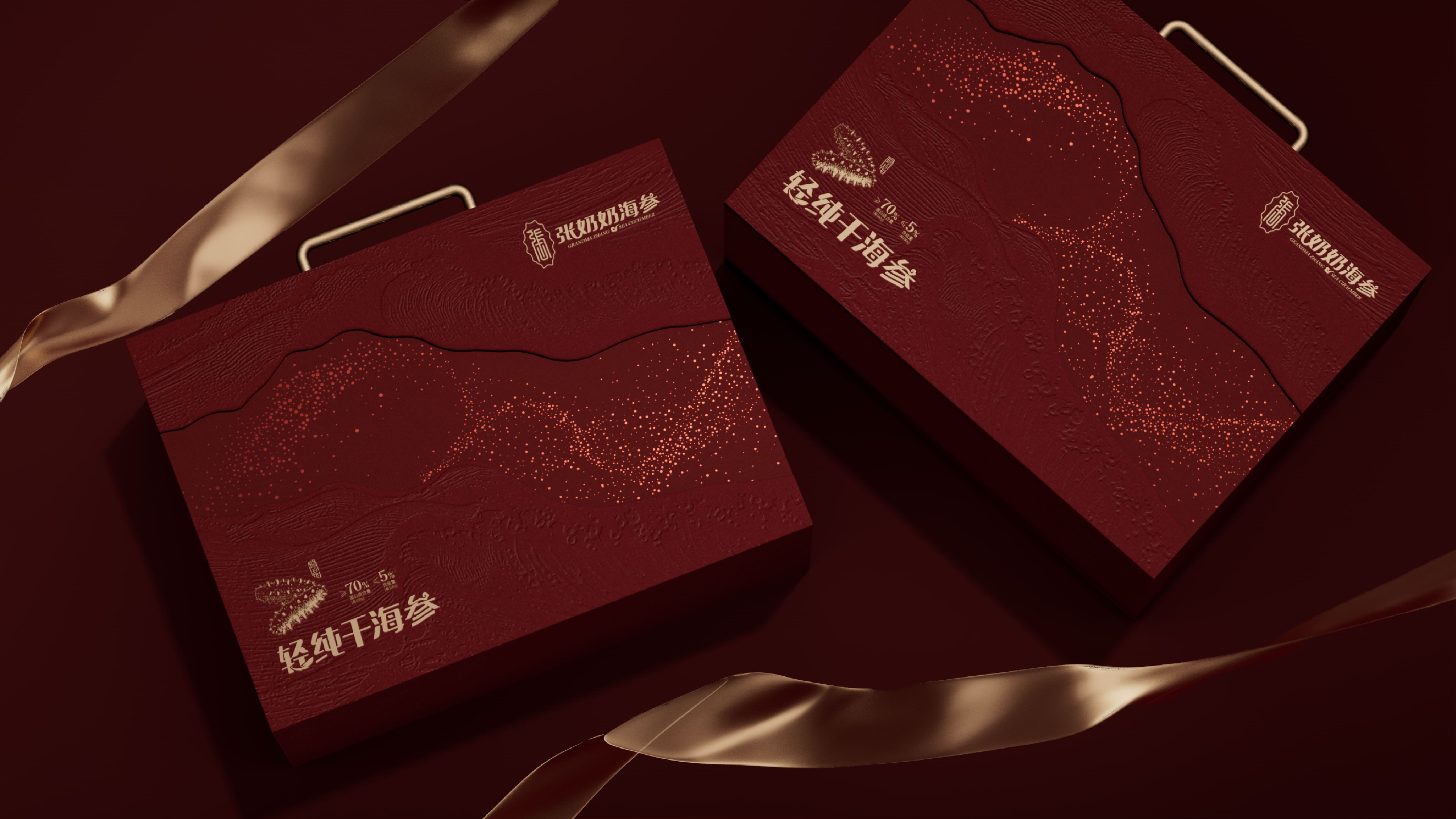 我们为张奶奶海参打造了一款高档礼盒,以深海美学与高端质感为核心。主体选用典雅红棕色调,浮雕海浪压纹还原大海肌理,金色沙粒点缀具象海洋栖息环境,营造轻奢层次。搭配金属提手,融入品牌标识与产品信息,融合海洋元素与高端属性,传递滋补价值与礼赠格调,VIP 卡设计更强化尊贵服务感。